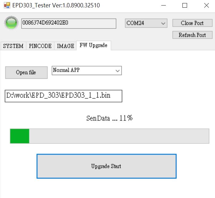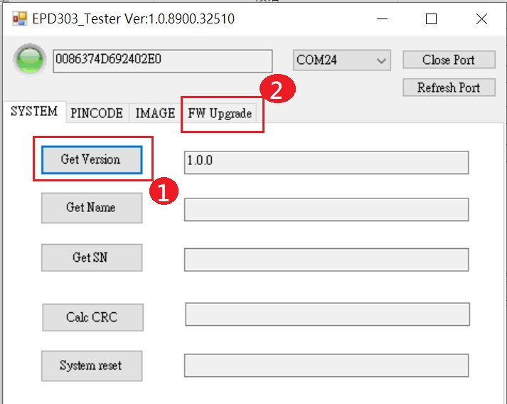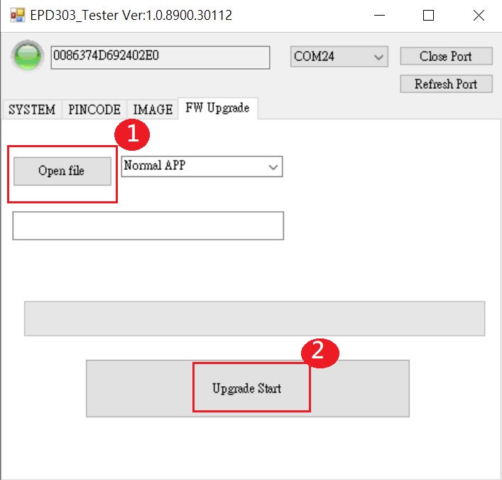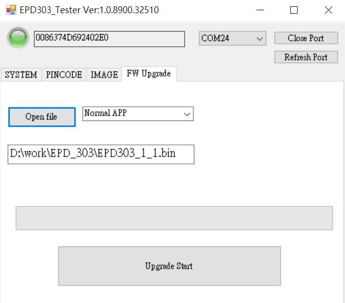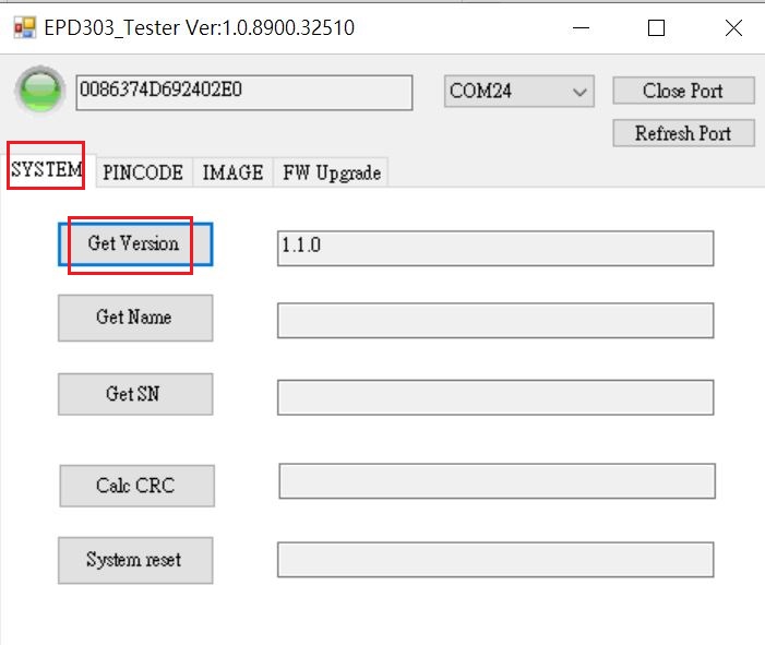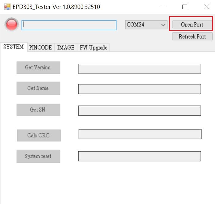 - 將Reader USB插入電腦,開啟EPD30xN Tester工具,確認COM Port正確並按下「Open Port」。